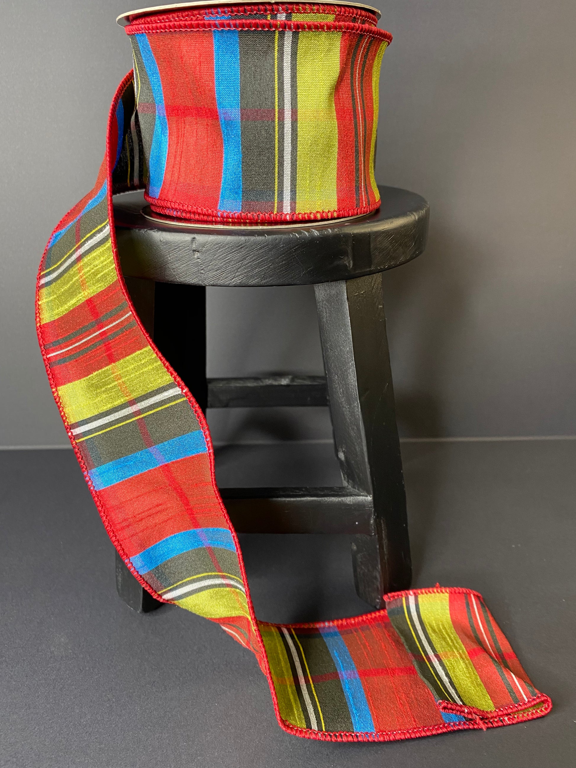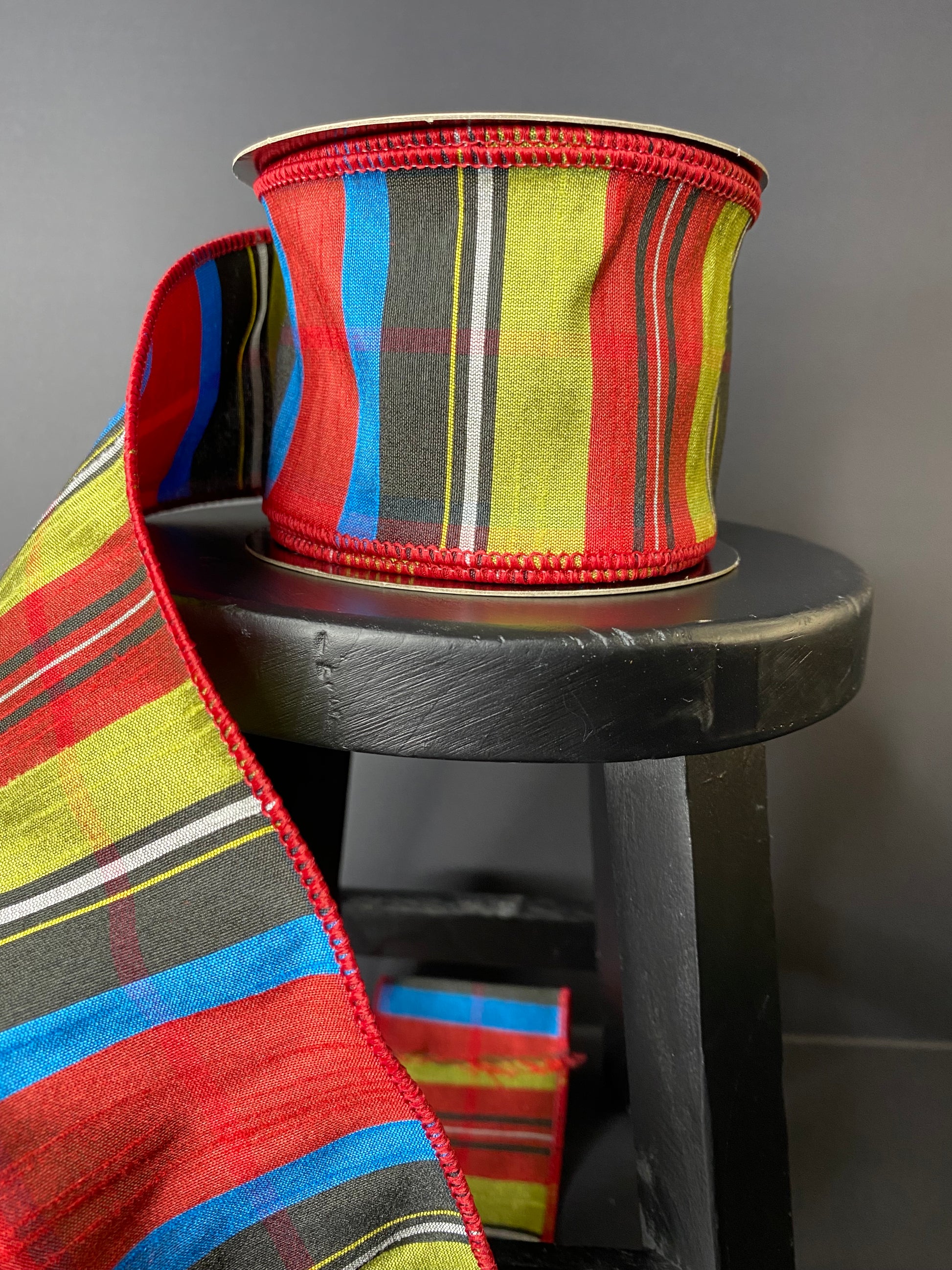 Ribbon-Nutcracker Plaid Wired Ribbon in Red, Lime, and Blue, dupion, 2.5"x10yds.