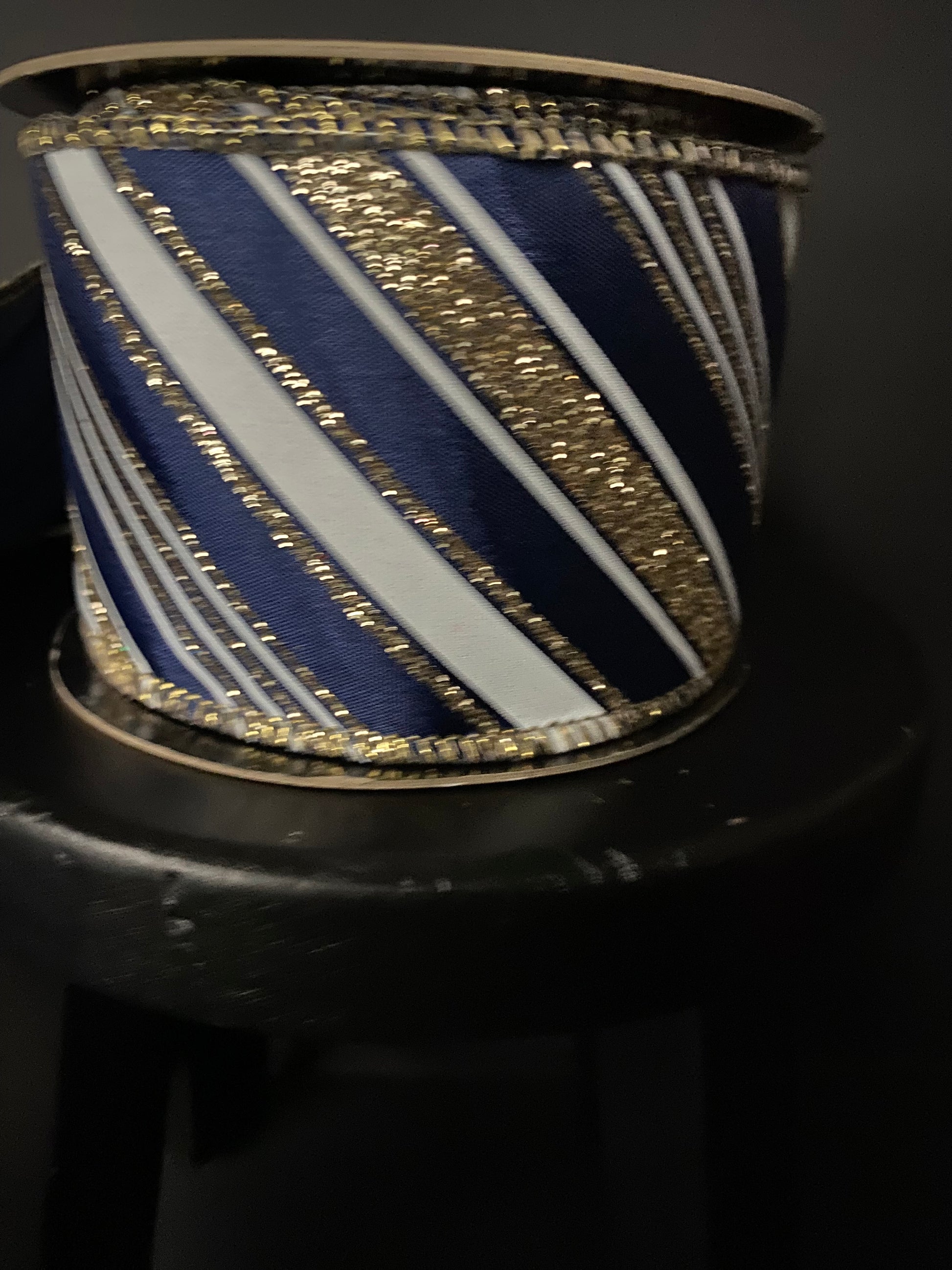 Christmas Ribbon in a Navy Double Platinum Glitter Stripe in a satin. It's a 2.5'x10yds of wired satin ribbon. It would be an elegant addition to your decor this Christmas. Put it on a wreath, garland or a big bow on a package! Christmas is coming!! Happy Decorating!!
